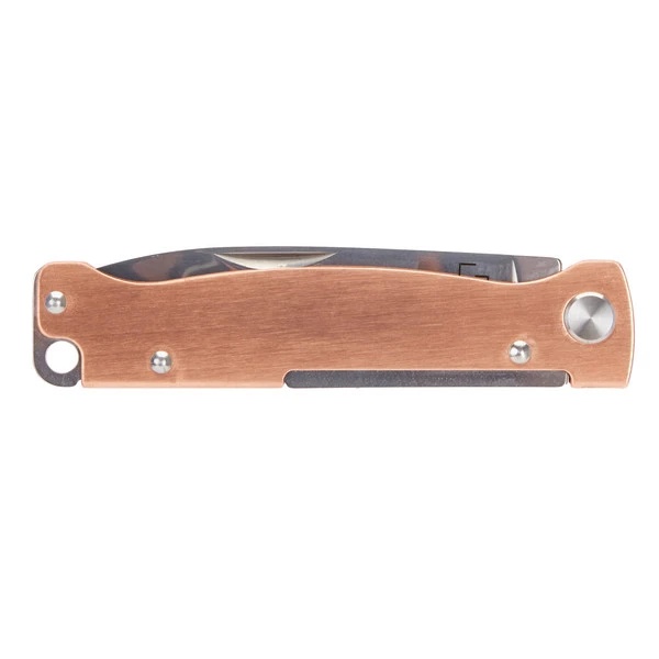 Schlicht, funktional und dennoch mit mit eigenem Charakter. So kann das Atlas Copper zusammengefasst werden. Denn der Griff aus glänzendem Kupfer nimmt mit zunehmender Gebrauchszeit eine einzigartige Patina an, die das Messer zu einem individuellen Einzelstück macht. Die Droppoint-Klinge aus rostfreiem Sandvik 12C27 Stahl wird per Nagelhau geöffnet und durch den Slipjoint-Verschluss in Position gehalten. Zum Transport kannst du das Messer mit dem verschraubten Tip-Up Clip an der Hosentasche befestigen.