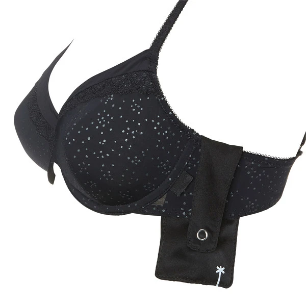 Du kannst die Akaroa unauffällig per Druckknopf-Lasche am BH befestigten. Die Tasche bietet Platz für Geldscheine und Kreditkarten.