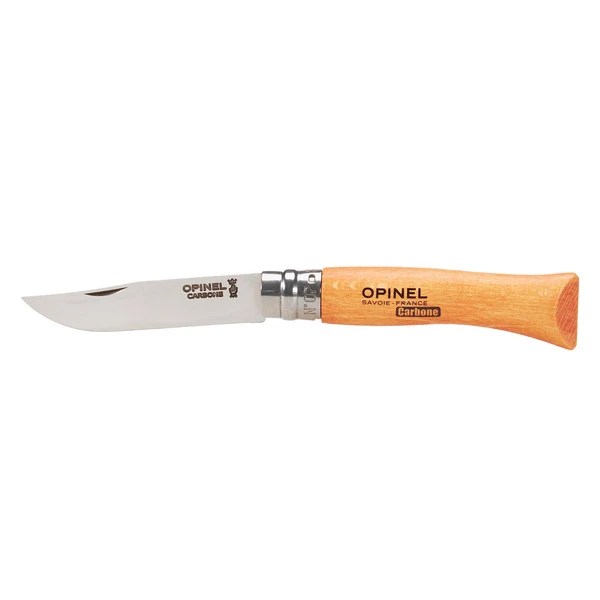 Carbon-Stahl (auch Kohlenstoff-Stahl, Karbonstahl) hat neben dem Bestandteil Eisen hauptsächlich einen hohen Kohlenstoffanteil. Carbon-Stahl ist zwar nicht rostfrei, hat aber eine hohe Schnitthaltigkeit bei einfacher Nachschärfbarkeit (gerade draußen ein nicht zu vernachlässigender Vorteil). Carbon-Stahl ist härter als nichtrostende Stähle – durch das feine Gefüge lassen sich Carbon-Stahl-Klingen sehr gut ausschleifen und haben dann hervorragende Schneideigenschaften.