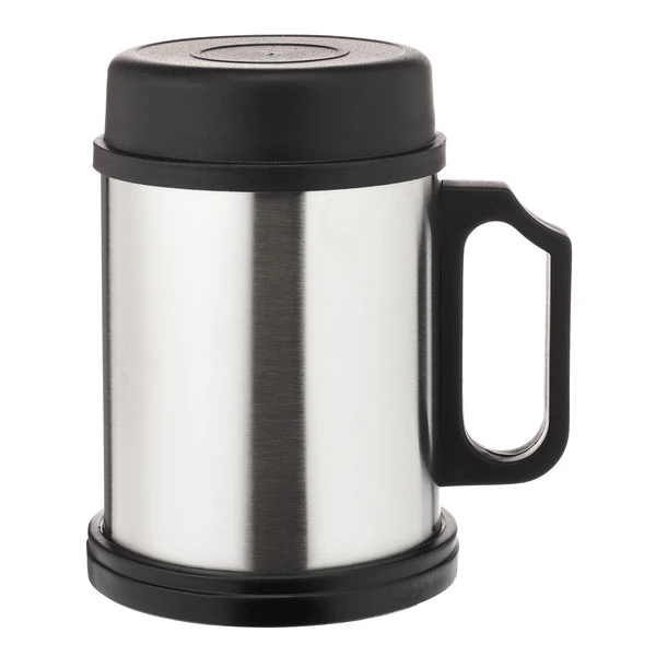 Gebürsteter Korpus aus doppelwandigem Edelstahl. Mit festschließendem Kunststoffdeckel (nicht auslaufsicher) und Kunststoffgriff, das nutzbare Volumen beträgt 0,35 L. Abnehmbarer Anti-Rutsch-Fuß.