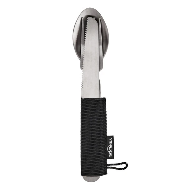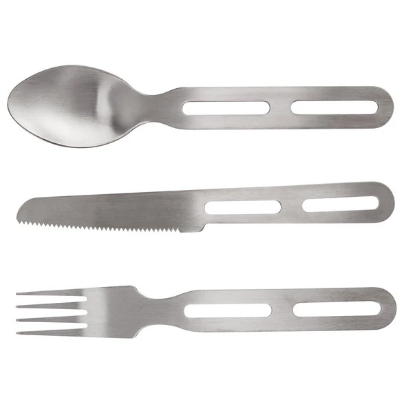 Besteckset bestehend aus Messer, Gabel und Löffel. Hergestellt aus 18/8 Edelstahl. Der Griff besitzt Aussparungen, um das Gewicht zu reduzieren.