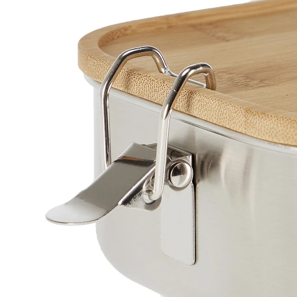 Edelstahldose mit Bambusdeckel und Bügelverschluss. Der Deckel kann als Brettchen verwendet werden, um Obst oder Gemüse zu schneiden.