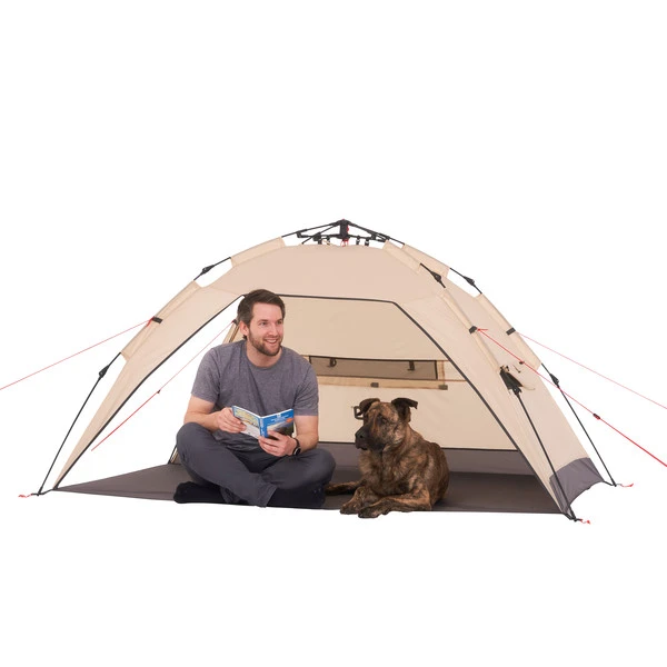 Es ist verständlich, dass niemand Lust hat, sich am Strand mit dem Aufbau des Equipments die Zeit um die Ohren zu schlagen. Viel schöner wird es da mit dem Buzzy, denn nach dem Auspacken steht die Strandmuschel schnell an ihrem Platz. Eine Bodenplane schützt dich und deine Sachen vor (nassem) Sand oder Rasen. Zwei verschließbare Fenster halten wahlweise den Wind ab oder lassen dich einen Blick aufs Wasser werfen.