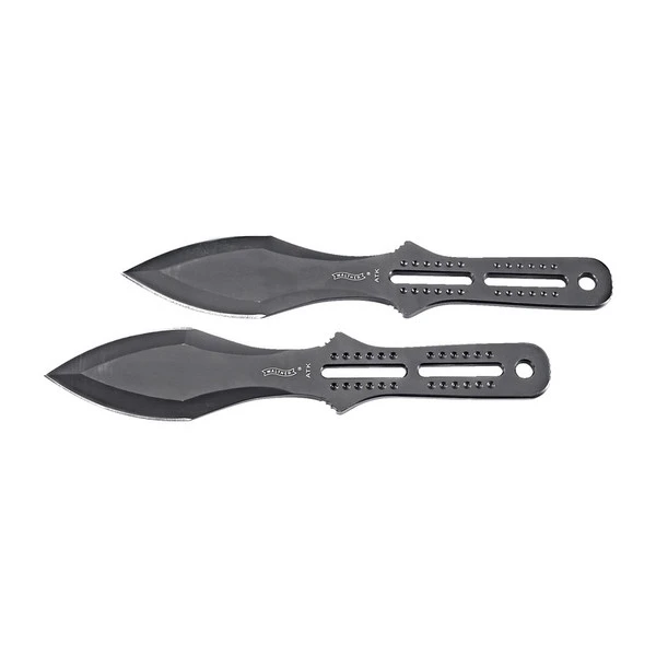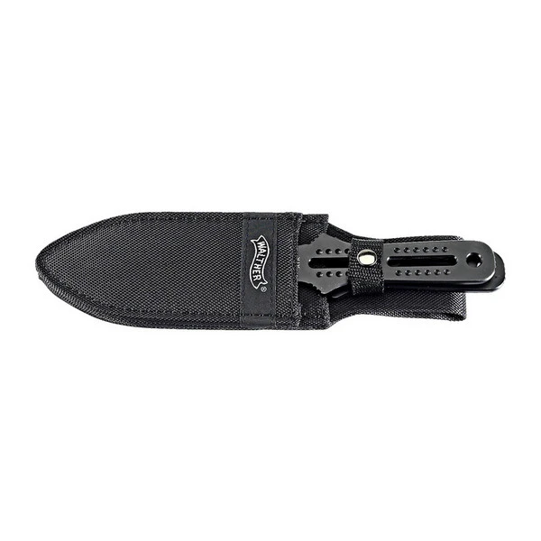 In der kräftigen Nylonscheide sind – mit leichtem Höhenversatz – zwei Wurfmesser untergebracht. Griff und symmetrische Klinge sind gut ausbalanciert und komplett schwarz beschichtet.